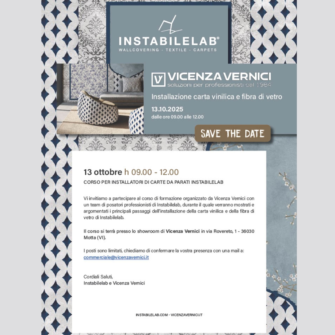 Partecipa al corso tecnico organizzato da Vicenza Vernici in collaborazione con il team di posatori professionisti di Instabilelab, per approfondire le tecniche di installazione di carta vinilica e fibra di vetro.